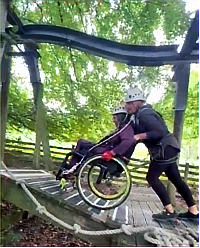 After breakfast on Saturday my group set off for a country adventure. Once our scooters, wheelchairs and equipment were loaded into the fully accessible ramped mini bus, we set off on a short trip. 10 to 15 minutes down the road. We parked up and enjoyed a leisurely ambient outdoor trail along a board walk observing some bird life, butterfly’s, squirrels and some beautiful countryside. The trail was accessible for everyone, wheelchairs, scooters and for those who were able to walk. After our ramble we arrived at a converted rail carriage with a café and enjoyed some refreshments and a cake or scone before we made our way back to the centre. After our soup and sandwich lunch, my group then headed to the outdoor rope breakout area in the hills, where we got kitted up for our afternoon rope pursuits course and zip lines challenge whilst the other groups were busy sailing, or doing archery or other activities.